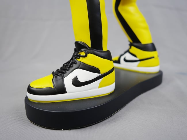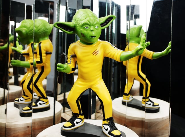 "Lee Strikes Back" is a stunning work of art that seamlessly blends the worlds of Star Wars and martial arts cinema. This sculpture Is a true masterpiece of creativity and craftsmanship, featuring the beloved character Yoda decked out in Bruce Lee-inspired attire, wielding a pair of double sticks.