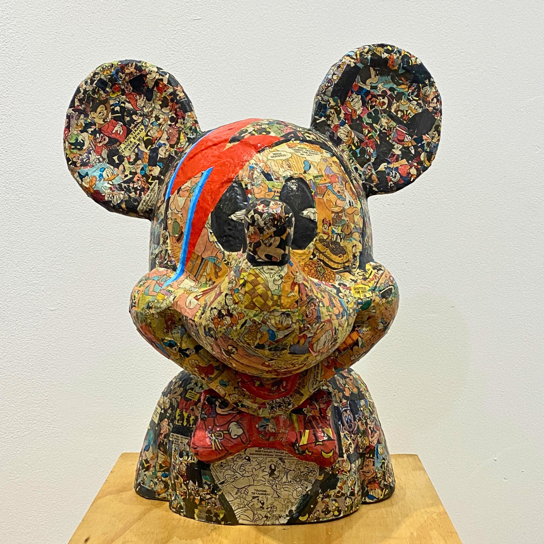 Get ready to be enchanted by this charming Mickey Mouse sculpture, meticulously handcrafted using traditional paper mache techniques. Every little detail, from Mickey's adorable round ears to his mischievous smile and expressive eyes, has been carefully brought to life. And guess what? The sculpture even takes a nod from the iconic lightning bolt eye of the legendary David Bowie, adding an extra touch of artistic flair. What's even better is that it's crafted with environmentally friendly paper mache, giving it a delightful texture and depth. Celebrate the magic of Mickey Mouse with this one-of-a-kind sculpture that pays tribute to an iconic artist. It's a must-have for any Disney fan!